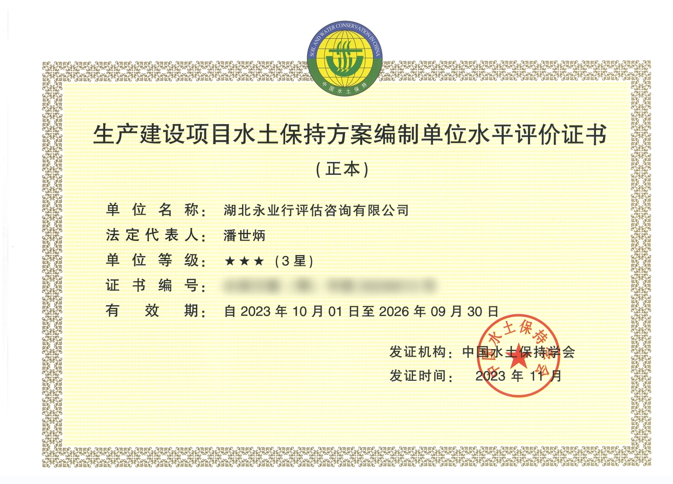 生产建设项目水土保持方案编制单位水平评价证书(3星)