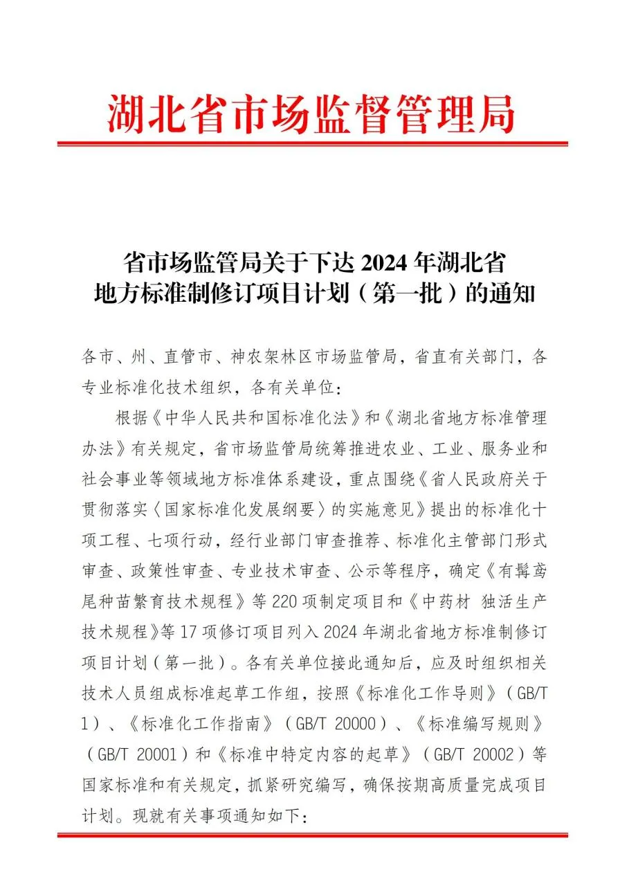 永业行2个湖北省地方标准项目成功立项